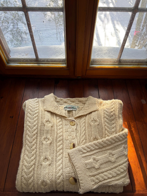 1990s Aran Ireland Merino Wool Cream Cardigan | Vintage Oversized Collared Fisherman Sweater